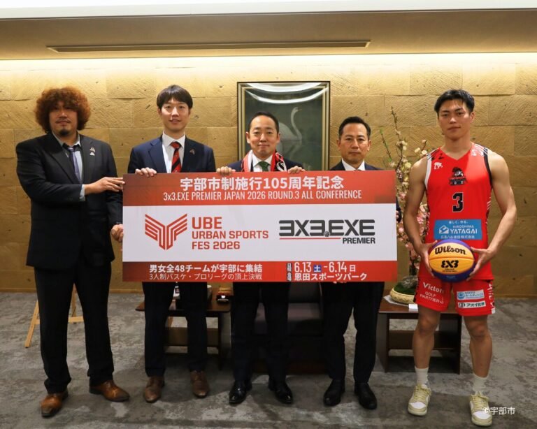 宇部市長へ表敬訪問、大会への意気込みを語る 6/13-14に山口県宇部市の恩田スポーツパークで開催される男子のALL CONFERENCE*と女子のROUND3。男子全チームが集結するALL CONFERENCEは「3×3.EXE PREMIER」JAPANの頂点が決まるともいえる大規模な大会です。 そのALL CONFERENCEが「ホームゲーム」として開催されるのは、12年目となるリーグ史上初!男子のALL CONFERENCEと女子ROUND3の両方開催により、日本中から計48チームの選手・関係者・ファンが集まる一大イベントを、山口県宇部市と3STORM.EXEが開催することが決定いたしました! 開催に先立ち、2026年4月11日に、3STORM.EXEの仲摩匠平代表、宇部ふるさと大使を務める宗野克洋選手、ならびに3×3.EXE PREMIERコミッショナーの中村考昭にて、山口県宇部市の篠﨑圭二市長を表敬訪問させていただきました。 2022年より継続的に3×3.EXE PREMIERを誘致している宇部市と3STORM.EXE。5年目にして満を持してのALL CONFERENCE誘致となり、開催に向けた強い思いを語りました。また、宇部市制施行105周年記念「UBE URBAN SPORTS FES 2026」の同時開催も決定しております。 大会スケジュール、出場チームの情報はこちら 【TEAM INTERVIEW】参入初年度から、5年連続でホームに大会を誘致。これを礎に、広島そして山口に3×3を根付かせる│3STORM.EXE *『ALL CONFERENCE』とは、男子全36チームが1つの会場に集結し、全チームで優勝を決めるラウンドを指す。通常ラウンドは、全36チームを3グループ各12チームに分け、グループ毎に優勝を決めるフォーマットのため、通常1会場に集まるのは12チームのみ。